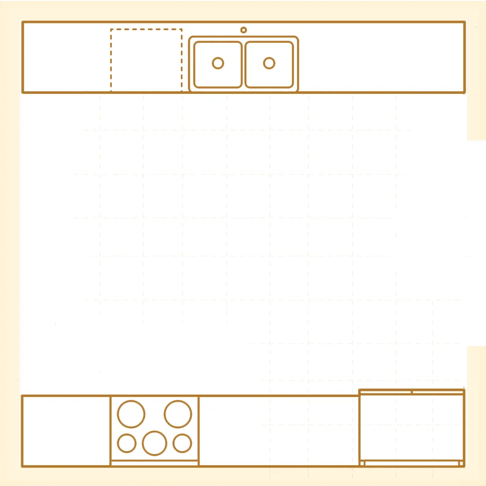 Features two parallel walls with a walkway in between, housing appliances and counters. Great for narrow spaces and efficient workflows (popular in professional kitchens).